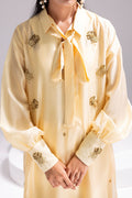 Make a subtle yet striking statement with ALARA, a graceful 3-piece ensemble in trending butter yellow, crafted from pure butter silk for an effortlessly refined drape. The long shirt features signature statement sleeves with wide cuffs, a collared neckline with extended ties, and delicate hand-embellished motifs along the front-balancing timeless design with contemporary polish. Paired with wide-leg trousers for a fluid silhouette and a pure cotton silk slip for breathable comfort, this look is perfect for festive day events, dholkis, and elegant summer gatherings. Color customization is available on request.