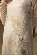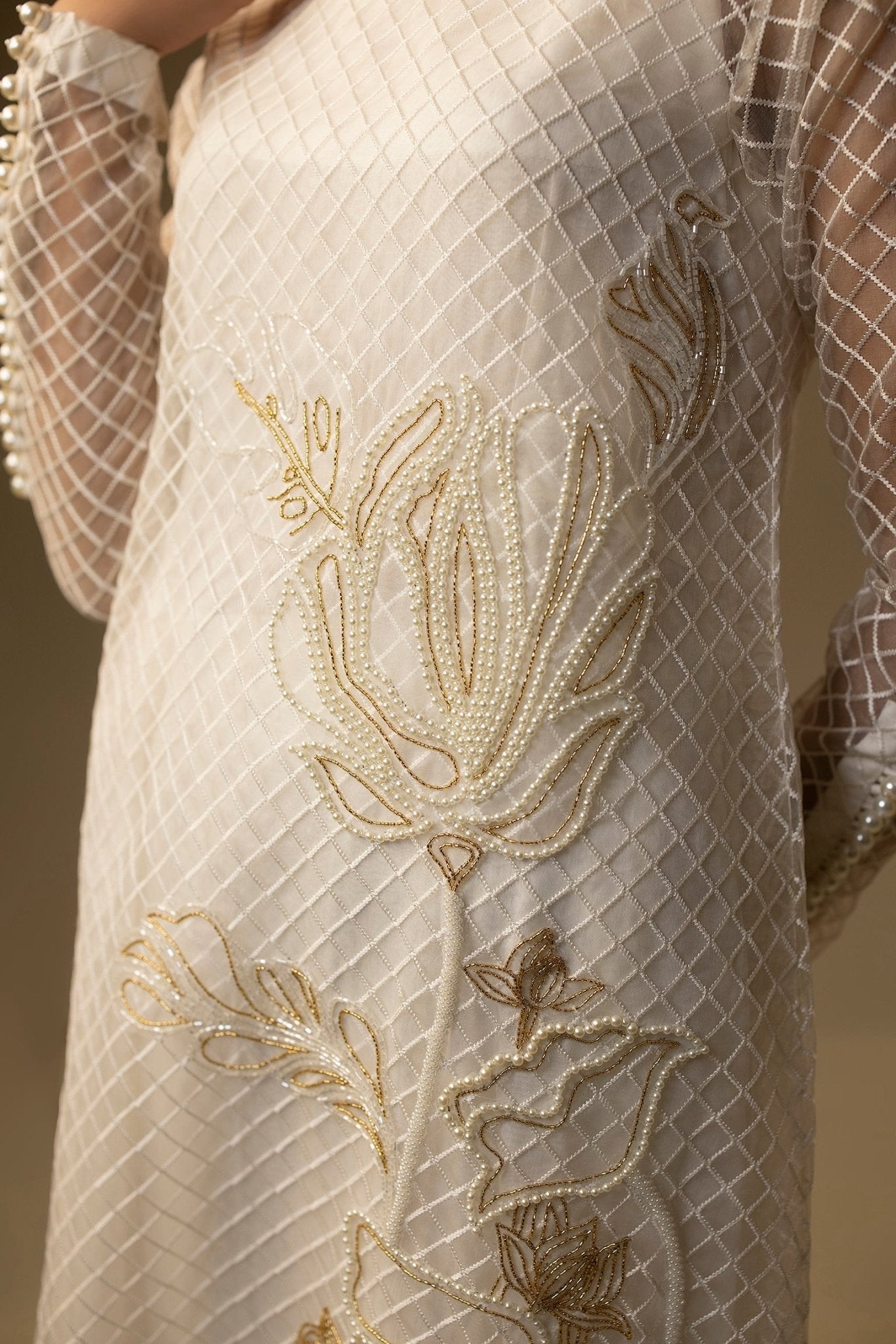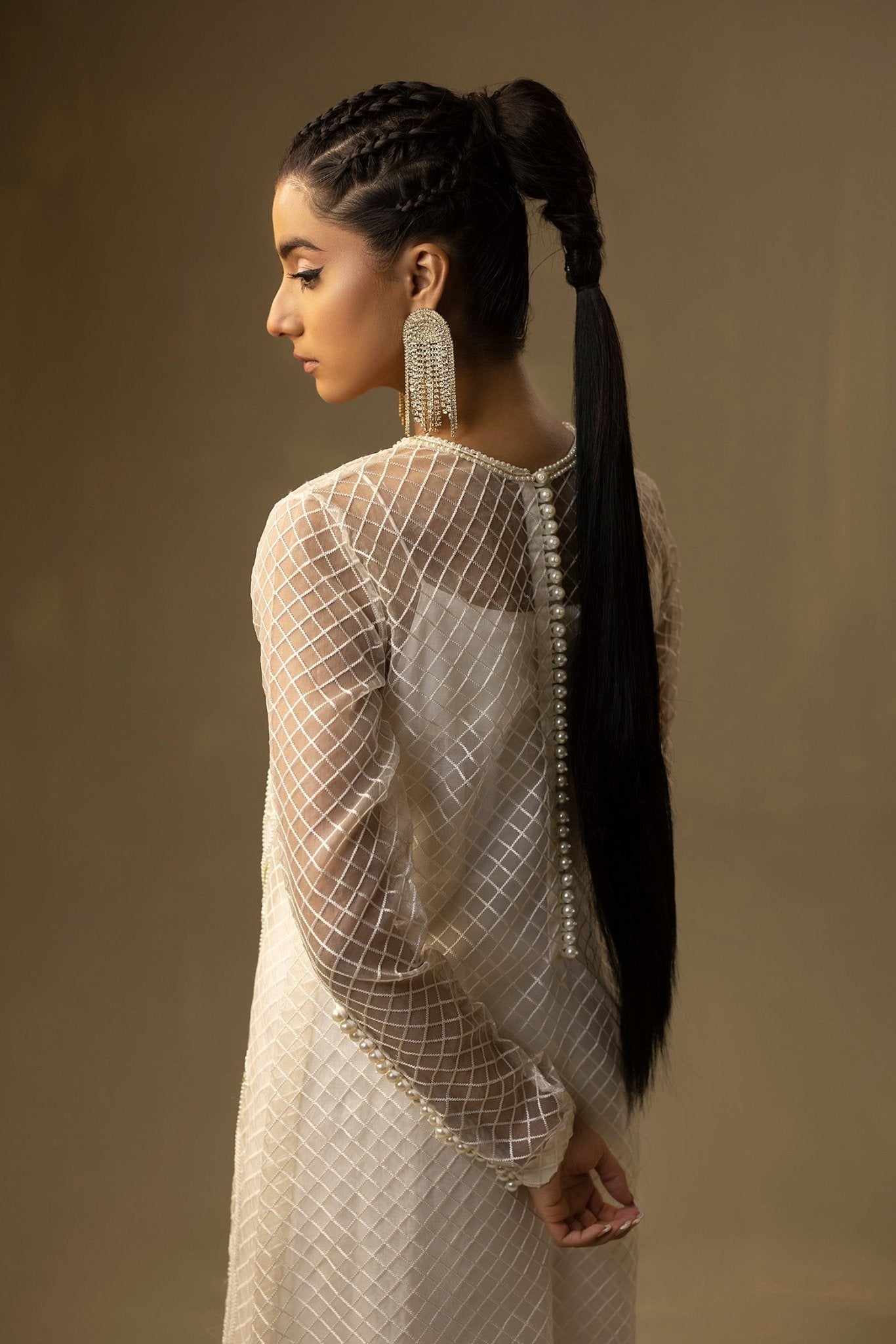 A PURE EMBROIDERED ORGANZA LONG KAFTAN SHIRT WITH HAND EMBELLISHED PEARL WORK AND PEARL DETALING ON SLEEVES AND BACK. COMES WITH A FULL LENGTH SLIP AND STRAIGHT CROPPED PANTS.