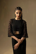 A pure embroidered organza matching skirt set with black crystal work and pearl embellishment. Comes with a short cape shrug and plain top.