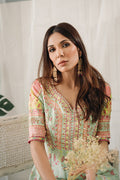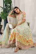 The kalidar  is fashioned from the finest pure raw silk, known for its luxurious texture and elegant drape. The pishwas features a refreshing mint green hue as its canvas, reminiscent of the coolness of a spring breeze. Digitally printed onto this base are vibrant florals in an array of summery colors - vivid pinks, sunny yellows, and lush greens. To enhance the beauty of the floral print, the pishwas is adorned with exquisite embellishments. Dabka and kora beads are meticulously hand-embroidered onto the fabric, adding a touch of shimmer and sophistication. Paired with the pishwas is a dupatta crafted from sheer organza, delicately printed with a complementary design. Silk pants can be paired as an add on.
