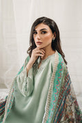 The shirt features a classic silhouette with a contemporary edge. The neckline and sleeves are adorned with intricate detailing crafted from dazzling Swarovski crystals, adding a touch of glamour and refinement to the ensemble. This mint green sheesha silk shirt with Swarovski crystals detailing is the epitome of refined luxury. With its classic silhouette, modern embellishments, and vibrant pairing with a digital silk dupatta, it is a versatile ensemble that effortlessly transitions from day to night, making a statement wherever you go.