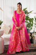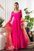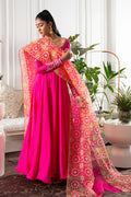 Oh so traditional and luxe is this khaddi silk hot pink flowy kalidar. Amalgamation of hand work( kora dabka, crystals, resham) and embroidery on sleeves is minimal yet so impactful making it perfect for the upcoming shaadi season and Eid get togethers. The dupatta steals the show¦our in-house print in contrasting colours and hot pink, finished off with kingri Gota lace. Put statement Tassles at the back makes the back dramatic. Pants are on silk. Style it up with kundan jewellery or studs and a dainty pouch or clutch this season.