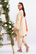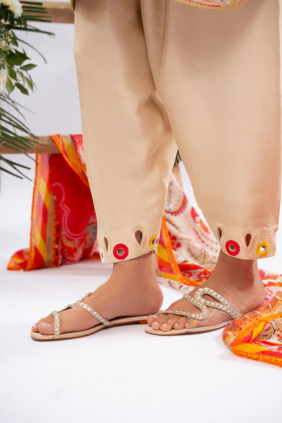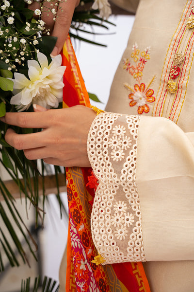 All summer vibes in this pure raw shirt with fresher embroideries and playful colour pop on neckline and our signature handwork buttons. Cutwork sleeves completes the elegant look. Shalwar has cutwork that brings out the short shirt. Our luxe printed dupatta on tissue silk on complementing colours is such a vibe.