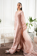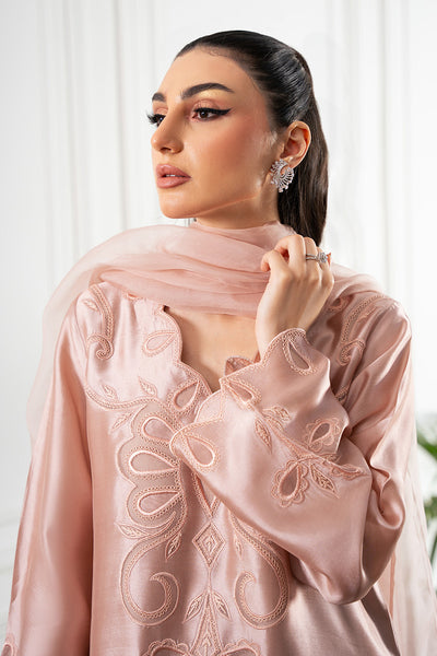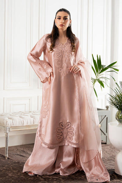 A dusty pink sheesha silk shirt is a true stellar showcasing the art of appliques and cutwork. An umbrella cut Dhaka compliments the otherwise round daaman kurta, giving it that volume. Organza dupatta with pleats and appliques makes everything come together for the perfect Eid luxe look.