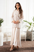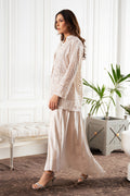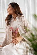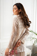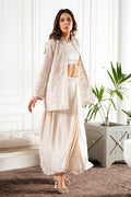 All in the details¦. Misty silver organza jacket is fully self embroidered and encrusted fully with hand work( pearls, sequence and Swarovski crystals). Chic silk pleated skirt is super chic and cut to perfection making the outfit edgy and elegant. Silk blouse glues the whole look together. Donn this in the upcoming wedding season and Eid lunches to dinners for the ever stunning look.