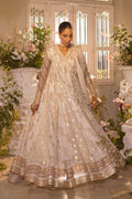 Old school angharka on chiffon canvas featuring hand block printed and gota details on each panel. The neckline is adorned with zari embroidered details. The fitted sleeves are enhanced with paisley applique motif which is further adorned with dangling pearls and crystal. The angharka can be paired with matching chiffon dupatta featuring block print and gota details. Pair it with matching raw silk pants to complete the look.