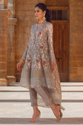 Flared silhouette high low shirt featuring silk thread rosettes in shades of deep pink and reds, the silk thread embroidered details are future enhanced with sequins, pearls and crystals. The top is paired with pure raw silk pants with fabric manipulation details.