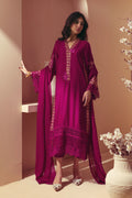 Long silhouette shirt in a deep cranberry hue, adorned with tonal and gold accent screen-printed details on the sleeves and side slits. The neckline is further enhanced with silk thread embroidery. The hem is elegantly accentuated with pleats and lace embellishments. The ensemble is complemented by straight pants and a coordinating chiffon dupatta to complete the look.