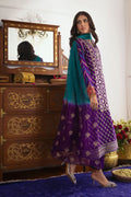 A long silhouette shirt showcasing striking hand block printed details in shades of emerald, silver, and gold. The neckline is elegantly adorned with handcrafted embellishments. The center front is exquisitely crafted from lustrous lorex fabric. This ensemble is accompanied by straight matching pants and a complimentary ombre dupatta in sea green and aubergine, finished with delicate gota work.
