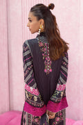 Long silhouette silk shirt featuring floral and geometric patterns on black canvas. The hem is adorned with light catching sequins on pure organza panel. The neckline is adorned with lace detailing set to perfection with handcrafted tassels. The neckline is further adorned with embroidered floral details. The shirt comes with silk floral dupatta.