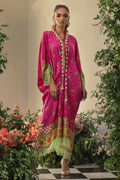 Long silhouette kaftan in gorgeous magenta shade featuring pearl embellished necklace on the neckline. The sleeves are adorned with zardozi and light catching dangling crystals. The hem is adorned with schiffli details.