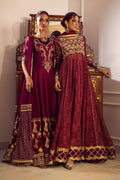 A floor-length kalidar in a striking shade of deep crimson, featuring intricate zardozi embellishments on the bodice. The flared panels are tastefully adorned with chunri block-print details. The sleeves are refined with zardozi and cutwork accents. The hem of the ensemble is elegantly finished with scalloped borders and gota manipulation, creating an exquisite appearance. This outfit may be paired with straight matching pants and a net dupatta, adorned with sequins and lace finishing for a sophisticated look.