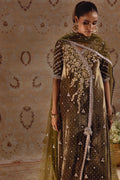 A stunning A-Line angharka crafted from exquisite olive green canvas and adorned with delicate silk thread resham rosettes in beautiful muted tones. Each resham rosette is intricately embellished with shimmering silver zardozi details, adding a touch of luxury. The center front features beautifully handcrafted tassels that enhance its elegance. Complete your look with the matching net dupatta, which sparkles with a sequins spray, creating a mesmerizing effect. Paired with wide-legged damask pants, this outfit promises to turn heads and make a lasting impression.