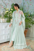 A floor-length kalidar in exquisite ice blue, crafted from embossed organza canvas, showcases a silk thread trellis on the bodice. The silk thread embellishments are gracefully adorned with intricate zardozi and pearl detailing. The center front is enhanced with a meticulously handcrafted embellishment. This elegant shirt can be paired with coordinating straight pants and an organza dupatta to achieve a timeless aesthetic.