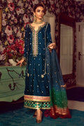 Long silhouette velvet shirt in head turning deep blue shade featuring zardozi embroidery on the neckline, the neckline is further adorned with contrasting finishing. The shirt is paired electric green raw silk izaar featuring cutwork details enhanced with old school gota techniques. The outfit can be paired with organza ombre zari dupatta featuring sequins details.