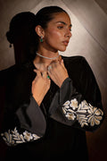 This sophisticated ensemble, featuring a rounded hem shirt with bell sleeves and matching pants, exudes timeless elegance. The intricate chawal taka embroidery in white and off-white on the sleeves and pants, while the shamouse panelling creates a striking visual contrast. The rounded hemline and applique detailing further elevate the overall aesthetic, making this outfit a true statement piece.