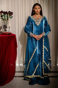 A sophisticated kalidaar ensemble featuring is adorned with intricate gold applique work. Accompanying dhaka pants with a net organza duppata which boasts captivating applique designs on all four sides. Exquisite dabka, silver, gold nakshi, sequin work, and gota tikki stones embellish the embroidery, creating a truly luxurious piece.
