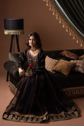 This black organza net peshwas is festive and an ideal pick for this winter season. The peshwas has intricate handwork on the bodice which is beautifully rendered on pure velvet and metallic block printed organza borders. This timeless silhouette is paired with an organza net dupatta which is adorned with diagonally placed gota lace and gota floral booti all over. Complete the look with our detailed lace velvet bag.