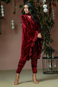 Deep crimson velvet flutter top, accentuated with satin detailing on the sleeves and a tie around the neckline. Paired with raw silk pants with velvet accents.