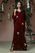 Maroon velvet kaftan with a beaded neckline and Swarovski bird motifs.