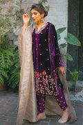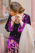 Spectrum violet hyderabadi loose kurta with floral resham and dabka detailing paired with a raw silk booti shalwar and a gold shimmer dupatta.
