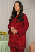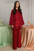 The Genevive ensemble exudes refined sophistication with its maroon raw silk jacket, beautifully adorned with subtle self-on-self embroidery paired with an exquisite bootleg pant.