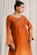 The Sienne outfit showcases a stunning rust ombre raw silk kaftan shirt, featuring intricate cutwork and a beautifully embroidered monochrome neckline and hem.