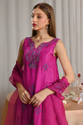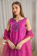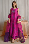 This Vivia outfit features a luxurious pure raw silk magenta sleeveless shirt with a cutwork neckline. The organza dupatta is detailed with intricate applique, while the izaar is beautifully adorned with applique and embroidery.