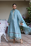 A stunning blue raw silk long shirt featuring intricate block print and a neckline embellished with elegant gold accents. Paired with a medium raw silk dupatta, showcasing a block print border and delicate gold detailing for a perfect blend of tradition and elegance.
