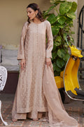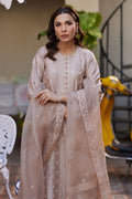 A taupe khaddi silk long shirt, featuring exquisite anchor work, paired with a khaddi silk block-printed Dhaka pant and an organza dupatta with elegant borders.