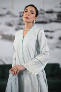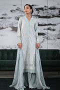 An enchanting ice blue long shirt featuring elegant bell sleeves, adorned with intricate lace details and soft white accents. Paired with sophisticated crushed dhaka pants and a printed chiffon dupatta.