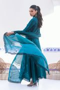 This stunning emerald green outfit features a long pure raw silk halter neck shirt with fitted sleeves and stylish cutouts at the shoulders, creating a modern and sophisticated look. The shirt is adorned with embroidery in shades of green and cutwork, adding a touch of elegance. It is paired with straight pants for a sleek silhouette. The ensemble is completed with a two-toned emerald green pure medium silk dupatta featuring embroidered organza on the sides, adding a luxurious finishing touch.