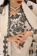 A classic white ensemble with black details featuring a raw silk short shirt and farshi shalwar. The shirt is adorned with intricate tribal motifs and cross stitch black embroidery, while the shalwar hem showcases elegant chawal tanka detailing. Complete the look with a striking white and black color block dupatta crafted from medium silk and organza, making this outfit a showstopper.