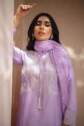 A lilac raw silk ensemble with intricate paisley motif detailing on the shirt, complemented by delicate button patti, transforms every glance into a moment of admiration. Paired with sleek straight pants and an ethereal organza dupatta.