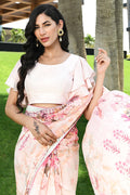A digitally printed pure raw silk saree with ruffle blouse and underskirt