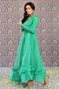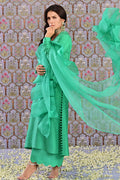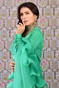 Paris Green pure raw silk straight shirt with loop buttons along the hemline. Paired with scalloped culottes and a sheer organza dupatta enhanced with one stitch ruffles on the pallu.