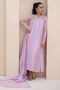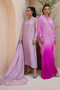 Embrace the allure of the Rose Pink raw silk and chantilly lace ensemble. The chantilly lace details on the shirt are a testament to elegance, embellished by handwork featuring cutdana and sequins. Draped in a medium silk dupatta with lace borders, and accompanied by sleek straight pants.