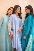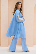 A periwinkle raw silk ensemble redefines elegance. A masterpiece of craftsmanship, the embroidered sleeves of the jacket tell a tale of artistry. Paired with a luxurious crepe silk inner and the graceful silhouette of raw silk boot cut pants.