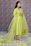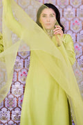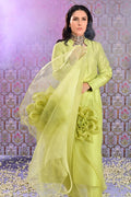 Chartreuse pure raw silk paneled A-line shirt with a star neckline paired with cigarette pants. Enhanced by a sleek sheer organza dupatta with oversized 3-D organza floral motifs on the pallu.