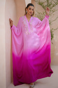 Draped in luxury: Fuchsia pink charmeuse silk dip dye kaftan. The embodiment of elegance with a touch of artistry. Resham embroidery, cutdana, sequins, and stones adorn the neckline, a masterpiece of craftsmanship.