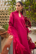 Cutwork schiffli pure raw silk solid crimson shirt with a feminine ruffled organza dupatta and straight silk pants.