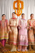 This exquisite ensemble showcases a timeless elegance with its ivory base adorned by a subtle yet striking print featuring hints of architectural elements in gold. The floral Jaipur bootis and trellis borders add a touch of traditional charm, while the intricate neckline and contrasting pink ombre dupatta create a sophisticated and modern appeal.