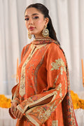 This outfits foreshadows a harmonious blend of burnt orange and antique tones. The dispersed front panel and rich gold borders create a visually striking effect. The bottom-heavy design and pop of aqua add a touch of modern elegance. The gradient dupatta in marron and olive, featuring a classic jaal pattern, completes the sophisticated look.