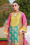 A vibrant multicoloured raw silk shirt, cut in a timeless Hyderabadi neckline, exudes classic charm with a contemporary edge. Paired with raw silk izaar pants featuring intricate block printing, this ensemble beautifully balances tradition and modern artistry for an effortlessly elegant look. .