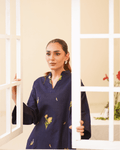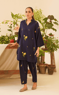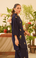 This trendy two-piece embroidered set features a stylish batwing-cut shirt with a modern band collar, designed in a chic short length for a contemporary look.