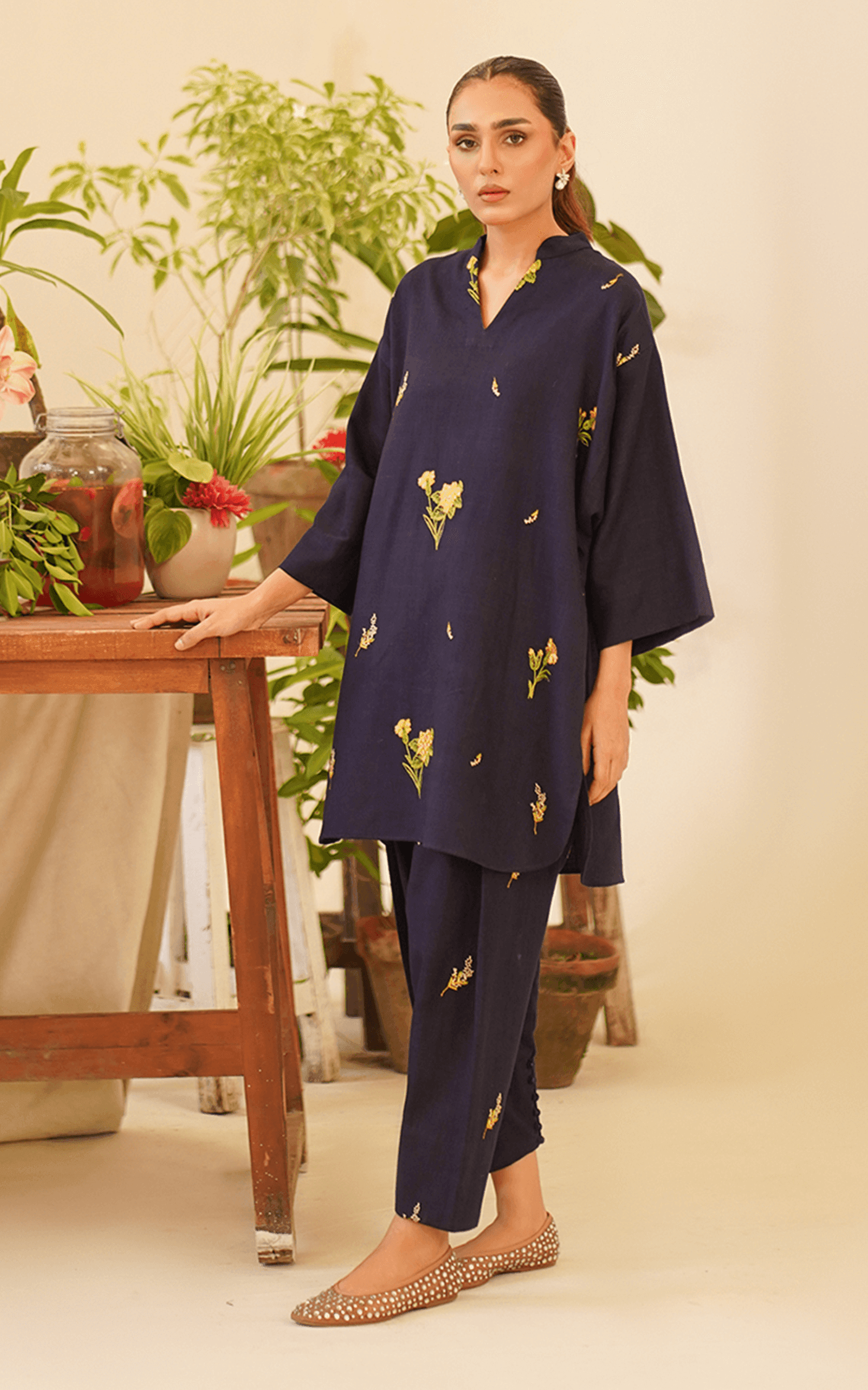The intricate embroidery adds a vibrant touch, while the basic shalwar, adorned with buttons on the seam, offers a flattering fit and a hint of detail.
