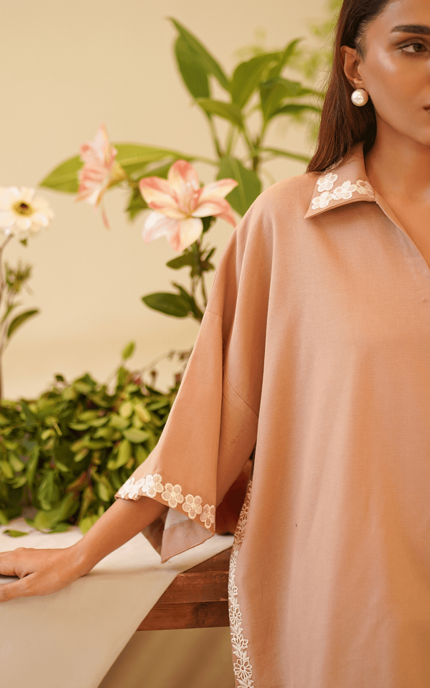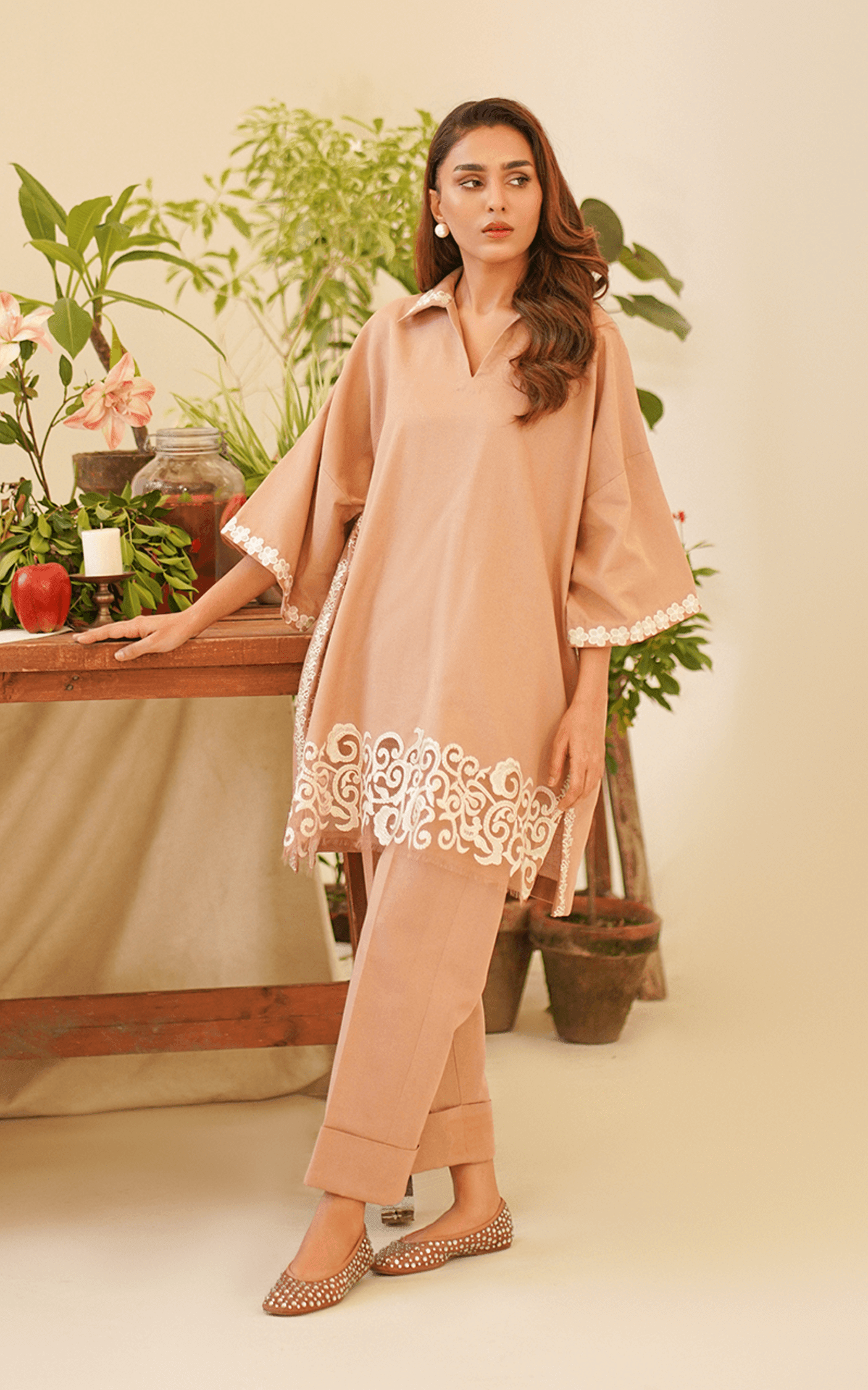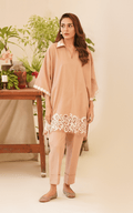 This captivating two-piece embroidered set features a shirt with a beautifully embroidered collar and an extended shoulder cutline, creating a relaxed yet sophisticated look.