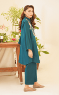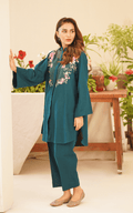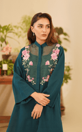 This elegant two-piece set features a front-open shirt with a chic band neckline, adorned with exquisite floral embroidery that adds a touch of femininity.
