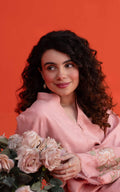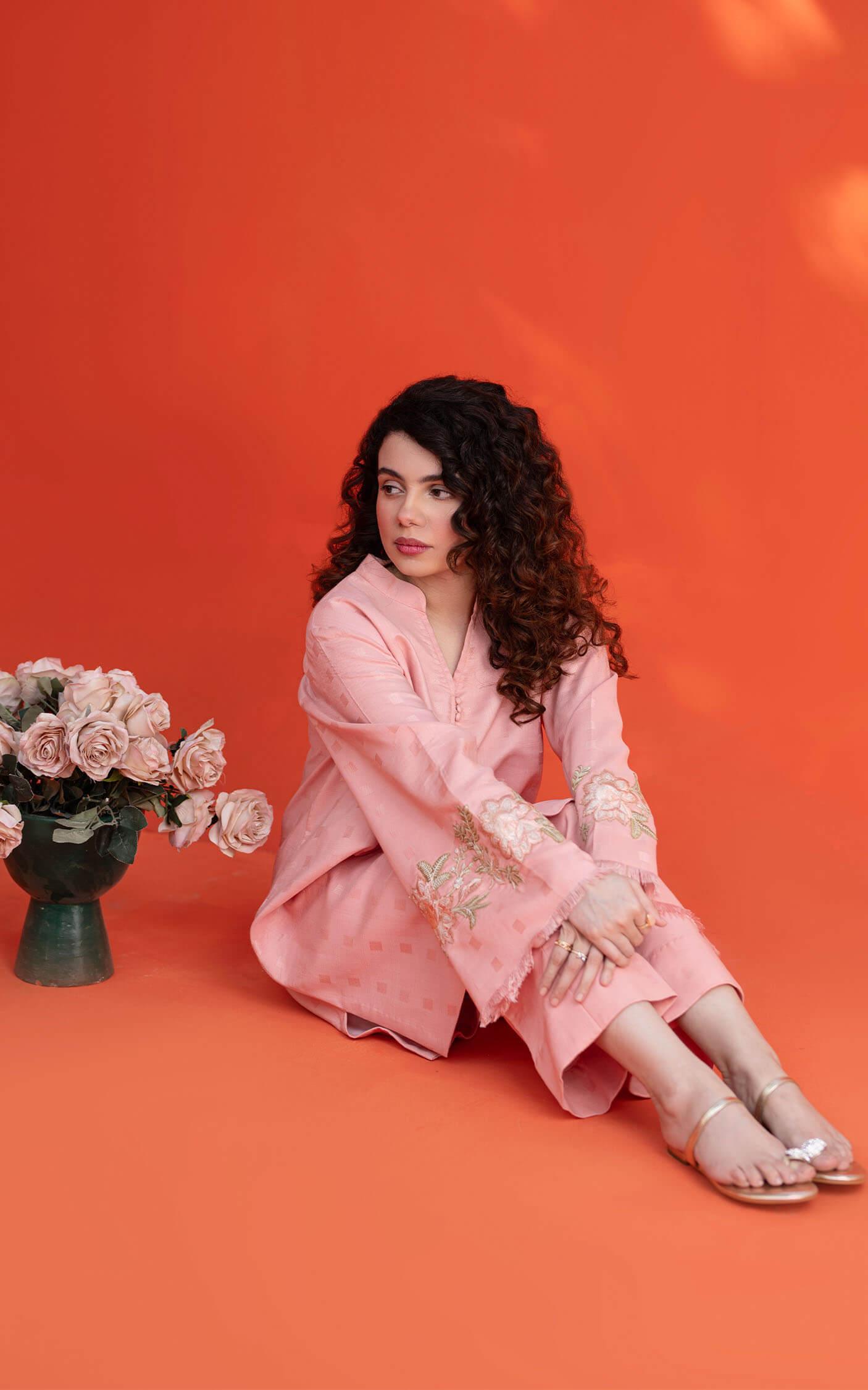 Dobby fabric blush pink lose fitted curtains with embroidered sleeve detail and with straight pants.