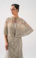 Elevate your formalwear with the Celeste Embellished Gown - a masterpiece of refined craftsmanship. This floor-length gown features a delicately beaded overlay, adorned with intricate threadwork, shimmering sequins, and pearl detailing that captures the light with every movement. The structured bareeze net cape-style bodice adds regal elegance, while the ornate embroidery across the shimmer fabric skirt offers a rich, textural depth that speaks of timeless luxury. Tailored in a soft champagne-gold hue, this piece blends modern silhouettes with heritage-inspired artistry. Perfect for receptions, red carpet moments, or elevated evening affairs - this gown is designed for the woman who commands grace, presence, and poise.